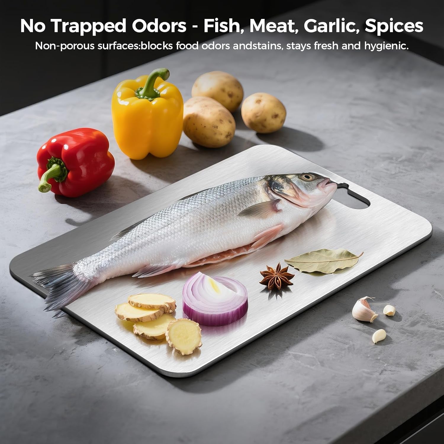 TitanBoard™ cutting board is highly durable, resisting scratches and dents, which ensures longevity. The non-porous titanium surface prevents bacteria buildup and allows a hygienic food preparation environment. These boards are gentle on knives, helping maintain blade sharpness over time.